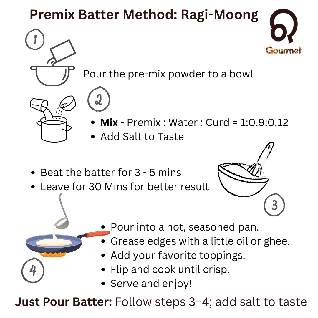 Ragi Moong Chakuli Batter is a fermented millet batter inspired by the traditional Odia pitha heritage. Made with nutrient-rich ragi and a balanced portion of whole moong dal, it’s infused with fresh herbs like ginger, cumin, and curry leaves. This wholesome, flavorful batter supports daily nutrition, suits all age groups, and pairs perfectly with a bowl of legendary Ghughuni.